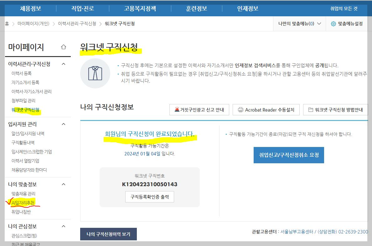 ♠ 마이페이지 워크넷 구직신청