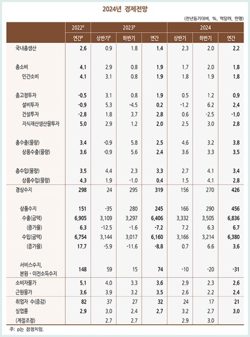 - 내수 성장세 둔화에도 불구하고 수출을 중심으로 완만한 회복에 초점을 맞춰 성장률 2.2%를 전망하고 있습니다. 이는 2023년 저성장(1.4%)에 따른 기저효과 영향으로 잠재성장률 전망치 2%를 소폭 웃도는 수준입니다.